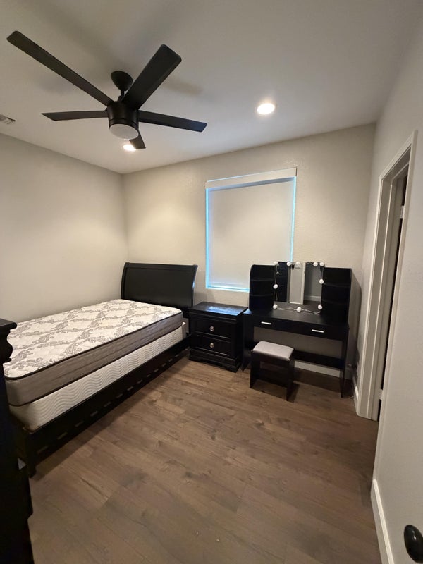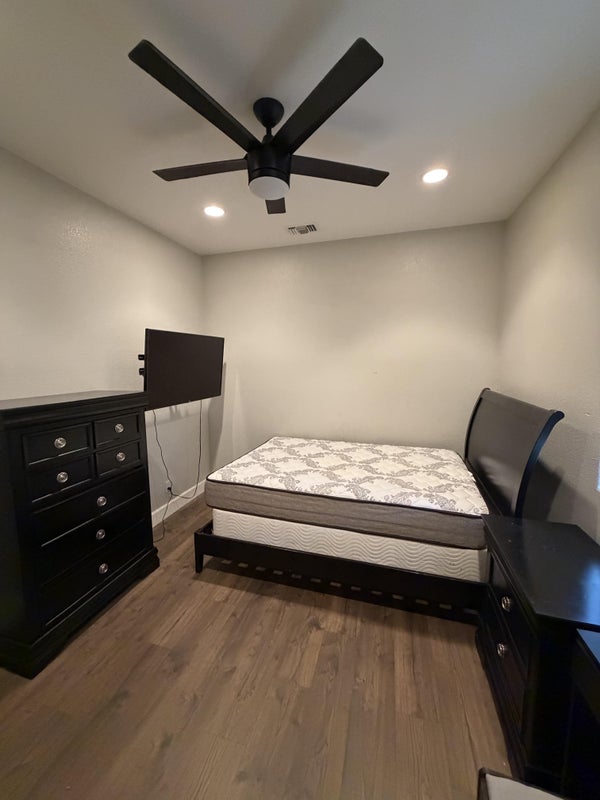 The room is a standard room size. It comes with recessed lighting, ceiling fan, window with a shade, and a walk-in closet. Rent includes all utilities, full access to kitchen and laundry, and monthly housekeeping of common areas and bathrooms.