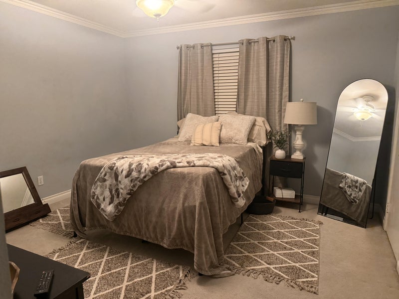 We have a large room for rent 12x12. It is currently furnished. Has a large walk in closet. If you have a smart tv we can share our login. We share all our tv apps if you don’t have any. We also have spectrum cable. The house is a large home, you have access to the kitchen, laundry room and we have a large family room. We are very clean and keep the house clean and organized. We have an extra refrigerator in the garage that you can use for food, but are more than welcome to use the kitchen fridge as well as long as you don’t touch our food 😃 we won’t touch yours. The bathroom is a shared bathroom with 1 other person. There is parking on the street, close to the park and mall. There is also local bus transportation near by. We are professionals and travel a lot, we sometimes work from home, we are very outgoing, love to cook, bake, watch sports, we are all about family.