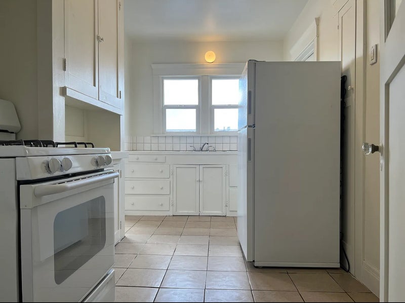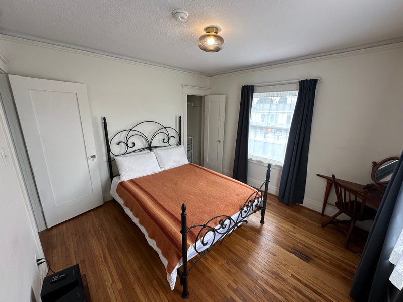 The furnished room comes with a queen-sized bed (including comforter, bedding, and two pillows) and a mid-century corner table and chair that can be used as a desk or vanity. The price includes all utilities: water, trash, electricity, gas, WiFi, and filtered drinking water. There is no laundry in the unit, but there’s a laundromat directly across the street with free dryers.