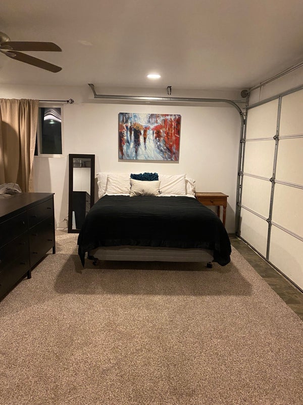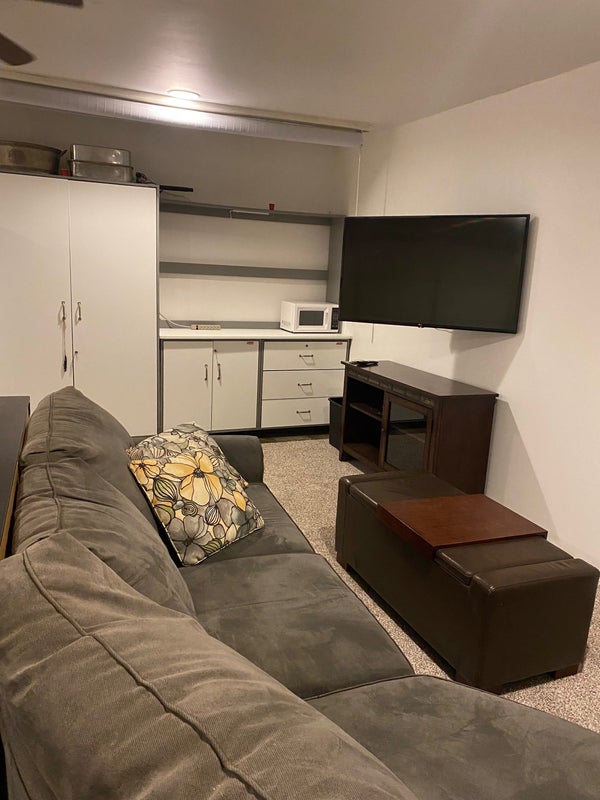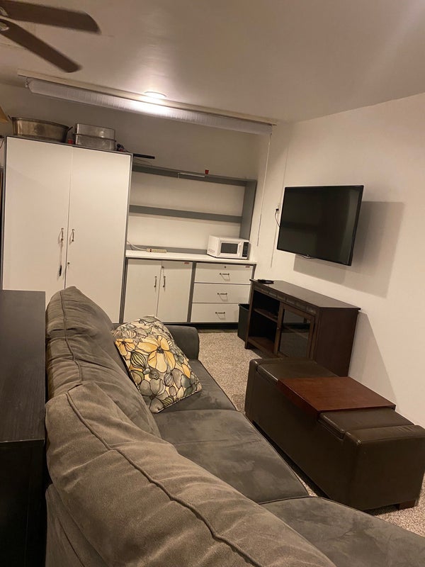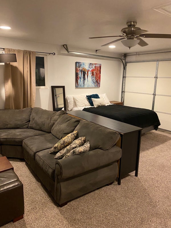 It can be furnished or not- I have a queen bed, L-shaped sofa, fridge, microwave and there is a built-in counter with storage. The back yard has a jacuzzi, greenhouse, natural gas fire pit and built in BBQ and there would be full access to the main house.
