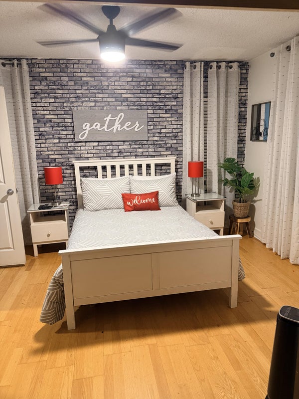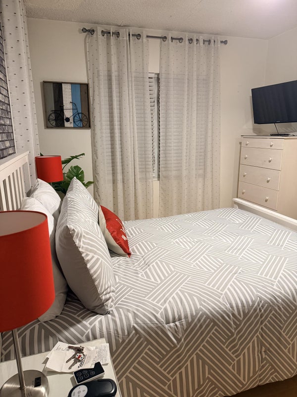 Your room rental comes with access to all the common areas in the home; Family Room, Den & Fully Equipped Kitchen. Both rooms are beautifully furnished, each with a full-sized bed, two bedside tables, a large dresser drawer, a ceiling fan, and a Smart TV.