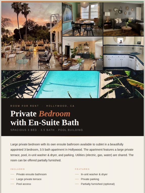 Looking for a roommate (or sublet) to join a well-appointed 3 bed / 3.5 bath apartment in Hollywood (West Hollywood Adjacent, the nicer part, Fairfax Sunset).