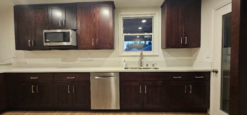 Fully equipped kitchen, separate laundry room with stacked washerdryer, a backyard deck with a louvered patio cover, and artificial turf front and back for lowmaintenance outdoor space.