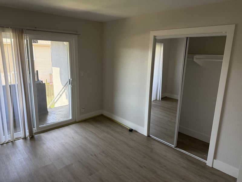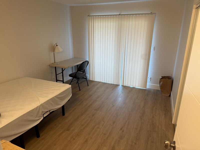 Spacious and private 140 sq ft bedroom available in a second-floor unit. The room features its own sliding door, providing direct access to the outside and offering both natural light and convenience. Includes a built-in closet with sliding doors for ample storage.