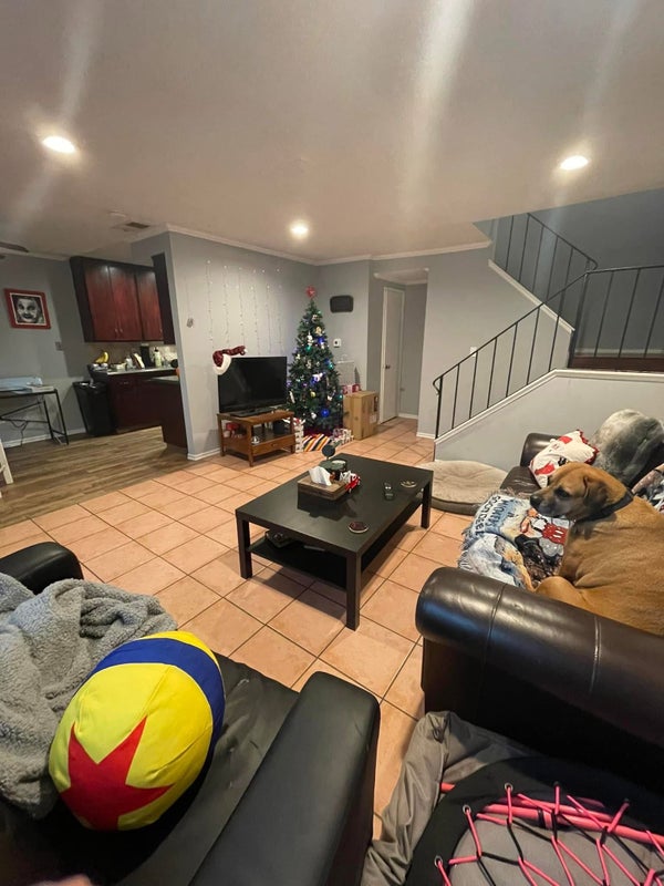 We are currently two couples living here, best friends, who will occasionally catch up after work. Late 20s/early 30s group. We have 2 cats and a large senior doggy. We are LGBTQ+ and friendly. But, there is no smoking of any kind in the house. We have a private patio out front.