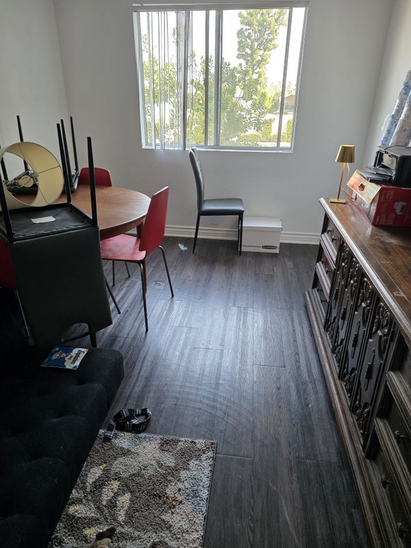 Room does have a dresser and futon, Can re-arrange or move furniture. Dining room table will be moved out. Has vinyl floors and area rug. Shared living room, bathroom and kitchen. Community pool with free WiFi and Gym. 3 Laundry rooms Elevators Gated community Walking distance to CSUF. Written lease and proof of income required. Must like cats, I do have 2 indoor only cats. Please leave message on voicemail or text me. My days off are different each week.