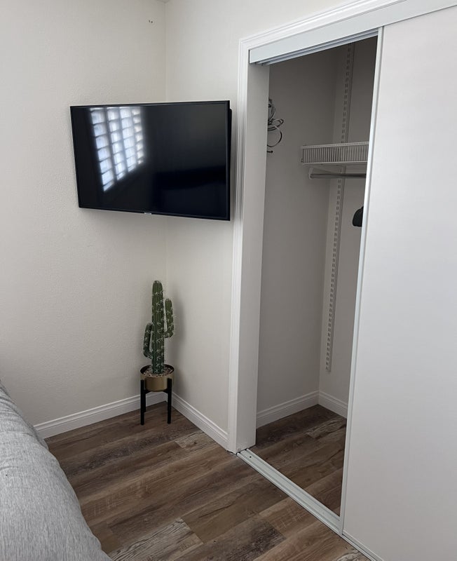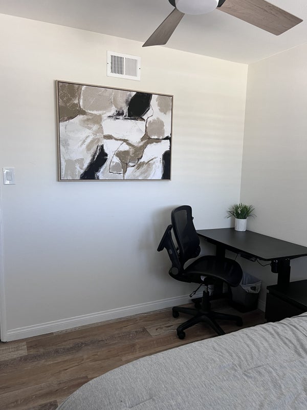 The room is furnished includes an electric standing desk, lamp, ergonomic chair, and a 40“ Samsung Smart TV on a swivel arm for your viewing pleasure and a shared bathroom with an tidy and clean housemate.