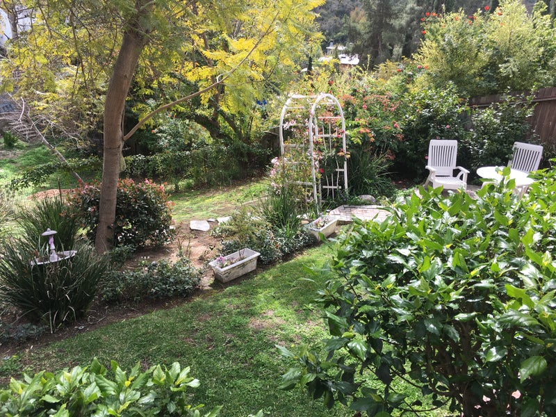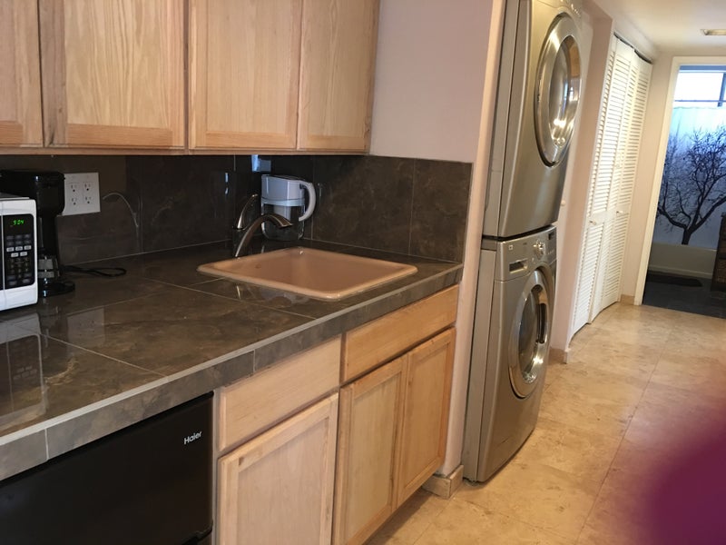 In Laguna Beach, in Bluebird Canyon, at the end of a one lane road. The area is very quiet and private, yet quite close to the town and everything going on. The house is built on the side of the hill and is 4 levels. The bottom level is fitted as an apartment with separate entrance with 2 bedrooms, shared bath, kitchenette, laundry, and living area. One bedroom is available. The room is about 10 x 12, with closet and view into the garden and canyon. The kitchenette has microwave, small fridge, and air fryer. The back garden with patio and barbecue is available to tenants. Room is furnished with a new queen bed, dresser, and night stand. All utilities included, parking, laundry privileges. The apartment area is shared with another tenant who has been here long term, he has a small dog. Owner is a retired attorney. Month to month available $1500/mo. Deposit $1500.