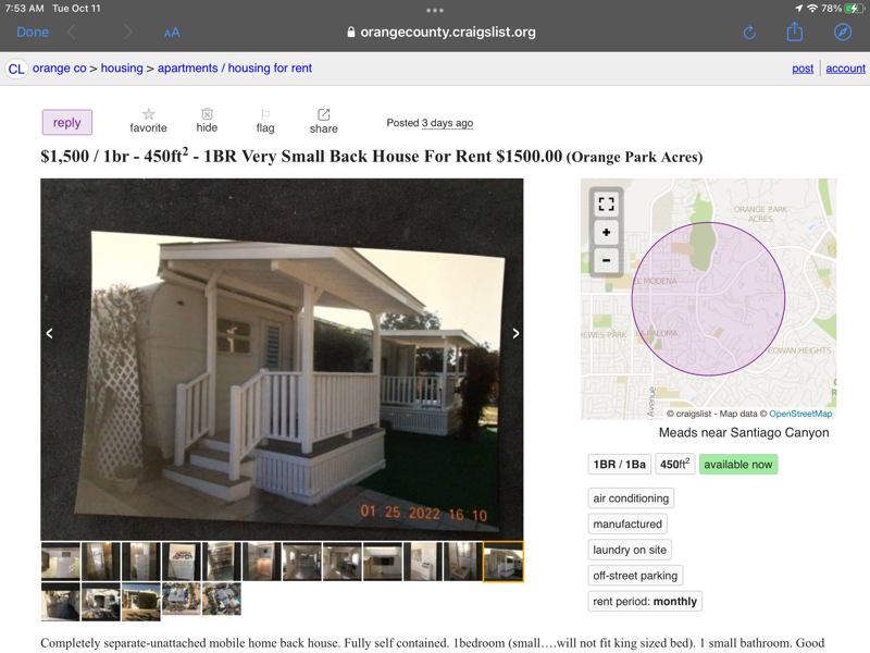 Completely separate little house. No shared walls. BR (small...will not fit king sized bed). Full kitchen with gas range, microwave and fridge included. Living room. Two private patios. One large storage shed. On horse ranch grounds in OPA. Many amenities including large swimming pool, multiple fruit trees, lots of space on the grounds all landscaped and maintained. Unit is small at sq ft. ONE EMPLOYED PERSON ONLY…..NO EXCEPTIONS! No kids, pets or couples. One parking space right next to the house . No electric car outlet option. All visitorsguests must park on street. This is a great value for ONE EMPLOYED PERSON. All utilities included except you provide your own cableinternet. Free shared laundry with other tenants on the property. Landlady also lives on the premises. Hoping to find a mature quiet person that appreciates privacy as much as the current tenants do. $month. $security deposit. Call owner directly at (no text msgs, this is a landline)