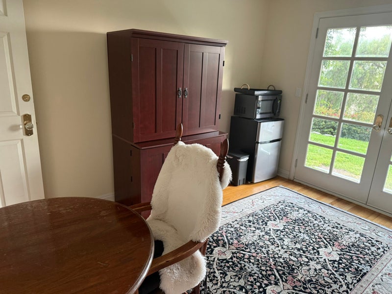 French doors, wood floor, new rug, new paint, desk, table and chairs, nice size closet.