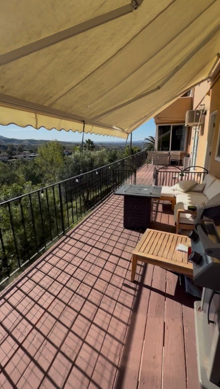 Beautiful apartment attached to $million home, overlooking Cleveland National Forest hills and Peter's Canyon Park in lovely Cowan Heights. Two large roomseach ' x 'first is combination kitchen with desk or dining area, inner room is big enough for king size bed plus sofa and TV area. Two closets, full bath, use of tropical landscaped pool area. Private sq ft deck with ' x ' canvas awning. Two parking spaces at end of driveway and private staircase to apartment entrance. Separate highend ductless minisplit air conditioningheating unit in each room. All Utilities plus highspeed internet and Direct TV included in $ monthly fee.