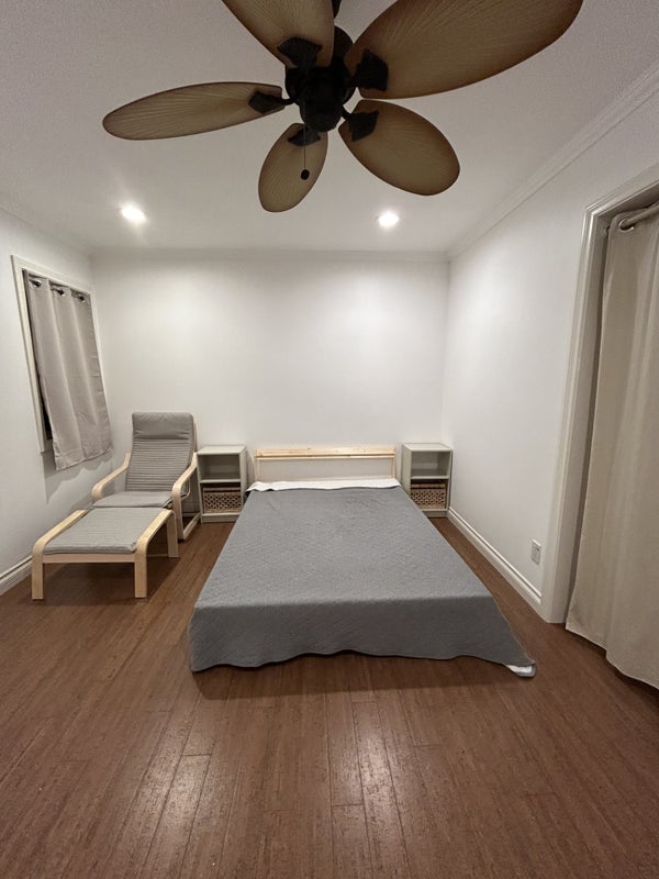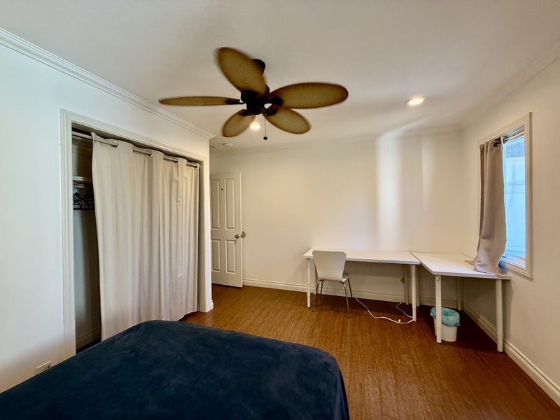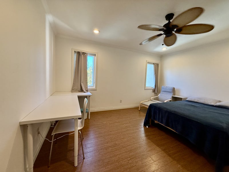 Bright, Clean, Airy, Fully Furnished private room (15x15 feet) which is tastefully decorated with Ikea furniture - full size bed, large corner desk and desk chair, two nightstands, lounge chair and a personal hotel-like safe for valuables. Has A/C, ceiling fans and blackout curtains. Ideal set up for a graduate student. The room is offered as furnished only with the option of using your own full size mattress or a mattress can be provided. The room cannot accommodate additional furniture other than a small bookshelf or side table for example.