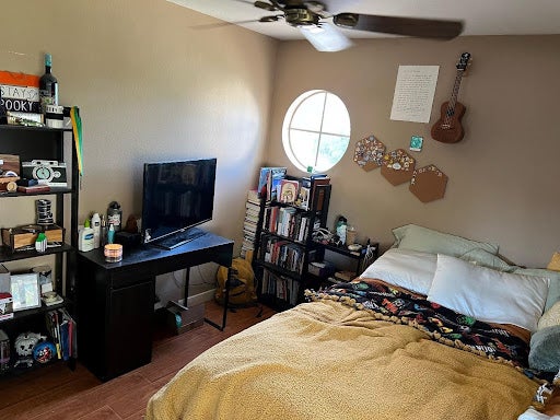 About the room: Fits queen-sized bed as shown Big sliding glass window Remote-controlled ceiling fan