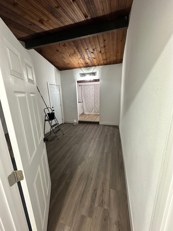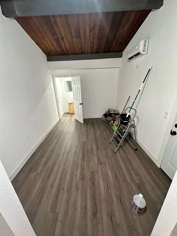 This cozy studio apartment with a full kitchenette showcases thoughtful recent upgrades that make it stand out for renters seeking a modern, low-maintenance living space. The efficient kitchenette features sleek white cabinetry with stylish hardware, durable granite countertops, a stainless steel sink with a contemporary faucet, and smart storage solutions ideal for preparing meals without sacrificing style or functionality. Beautiful luxury vinyl plank flooring runs throughout the space, complemented by fresh neutral paint and vaulted wood-paneled ceilings that add warmth, character, and an open, airy feel despite the compact footprint. The fully renovated bathroom offers a spa-like retreat with a modern vessel sink on a clean vanity, matte black fixtures, a large mirror with integrated lighting, and a spacious shower-tub combination complete with built-in shelving for convenient storage. Additional desirable features include a mini-split air conditioning system for efficient, quiet climate control suited to Banning's climate, updated lighting and hardware, and an overall move-in-ready vibe that feels far more polished than typical studio rentals in the area. These upgrades combined with the property's quiet neighborhood location create an attractive, comfortable studio that appeals to singles, couples, or anyone looking for affordable modern living with premium finishes.