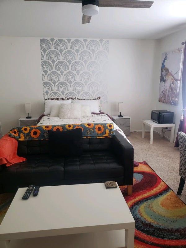 Me and my spouse live downstairs. We have a large furnished room upstairs we are renting it out to working professionals. No hallway. Utilities included. Kitchen and laundry are shared. Bathroom is inside the furnished room. We have 1 small dog. Tenant must love dogs! Place was rented out for a long time and was a favorite place among renters. Serene and quiet place. Close to shop, stores and winery.
