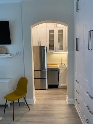 Beautiful, clean, newly remodeled detached casita with private entry off shared courtyard with large table & overhead string lights, perfect for winter entertainment. This true 'tiny house' 250sqft, has a full kitchen with quality appliances: fridge, micro, stove, oven, dishwasher, stone countertop; restroom contains: stacked washer & dryer, cupboard storage, shower, sink, toilet, full length mirror on pocket door, mirrored medicine cabinet, towel hooks; main room has