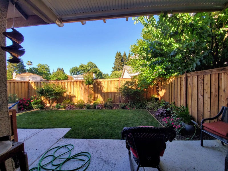 Outdoors: A small backyard patio and a peaceful garden.