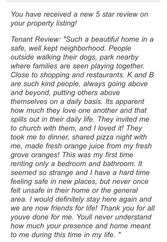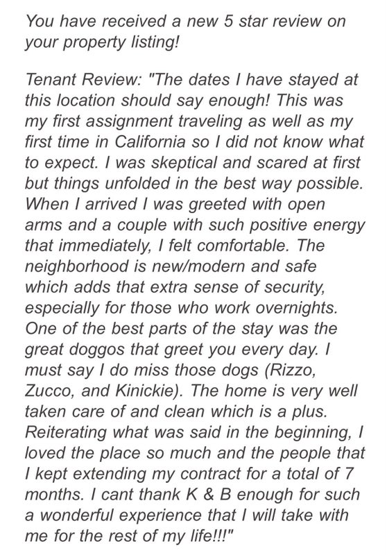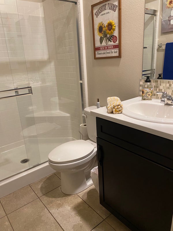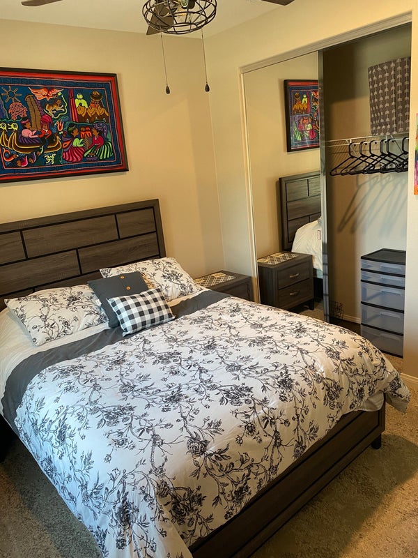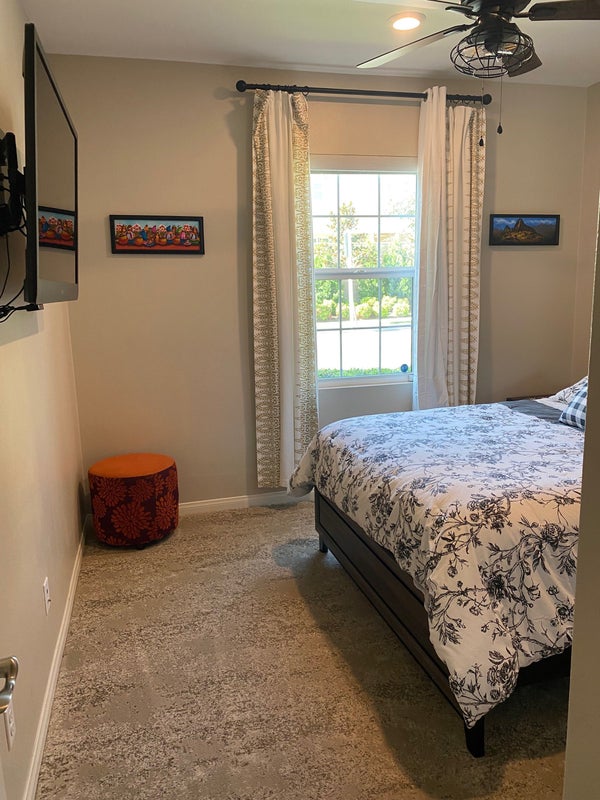 Our home was the model home and we have 1 fully furnished bedroom and full bathroom downstairs right next to the front door. Parking right in front of home. You will have access to home fridge, washer/dryer, kitchen, housekeeping and Parkhouse where there’s a gym and pool available. 3 dogs do live in home.