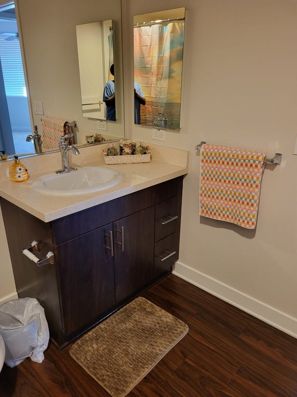 1 bedroom with walk in closet. Private bathroom on own side. Washer and dryer in apartment. Shared kitchen, living are, patio and refrigerator. On-site pool, gym, spa. Garage included