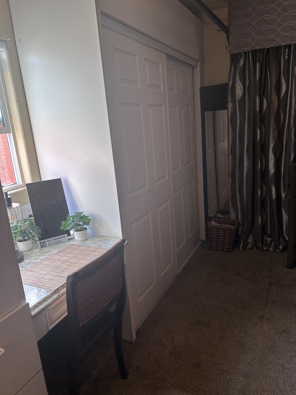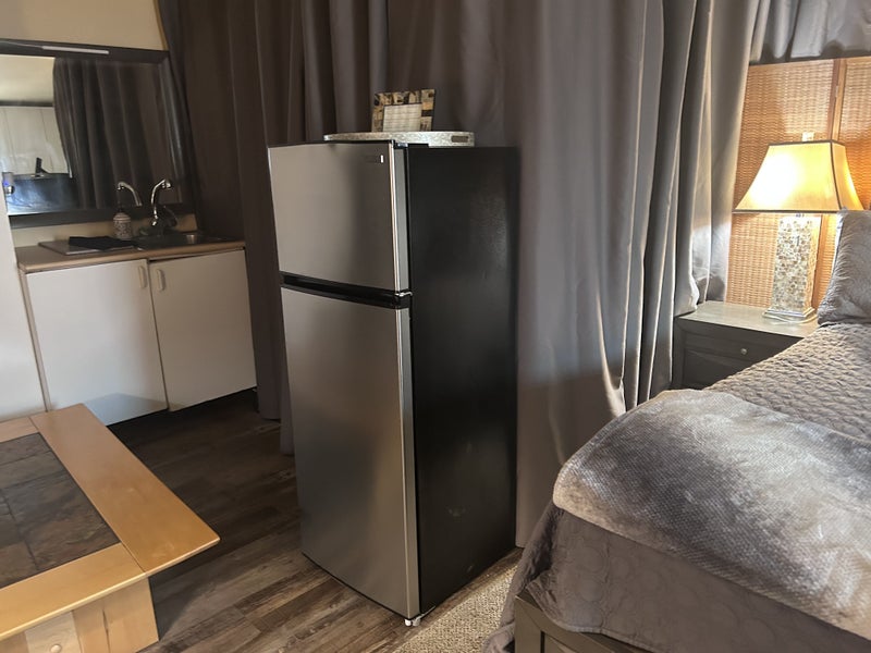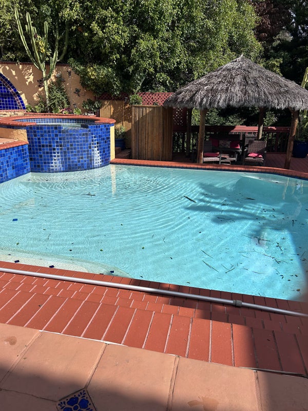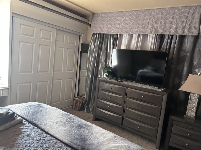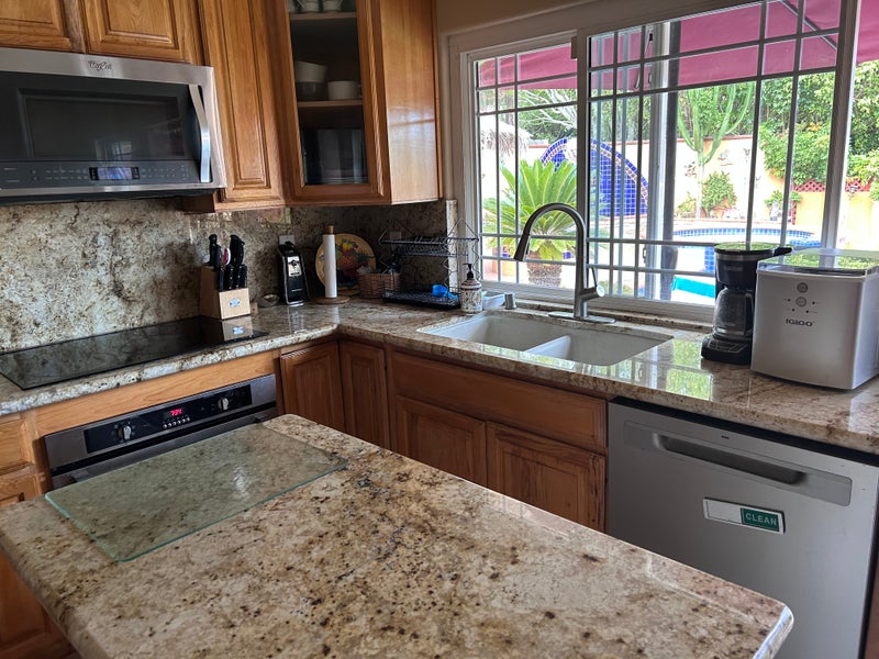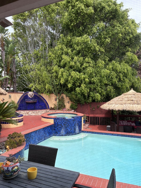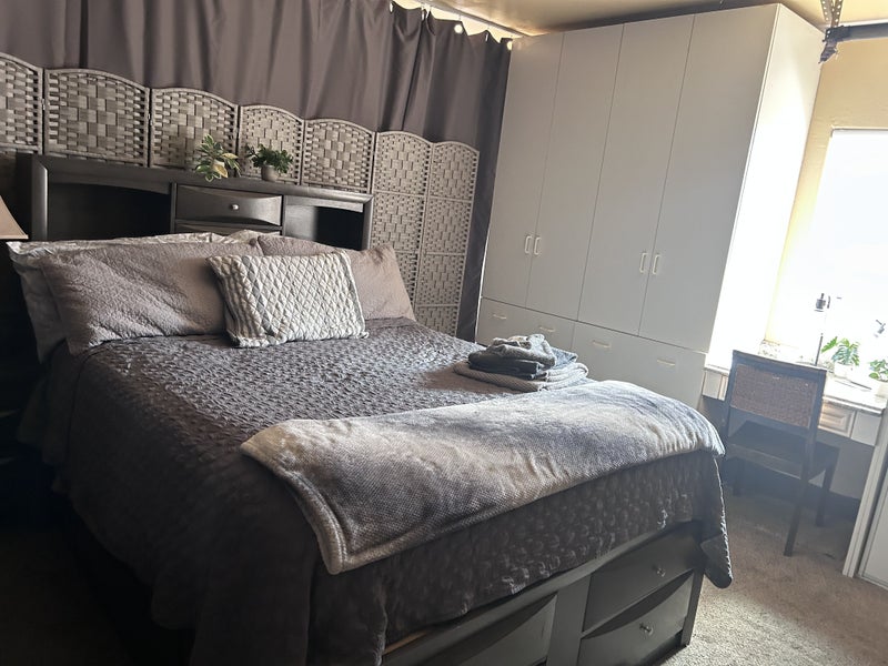 This large garage conversion room is fully furnished and includes a sink, window and a separate entrance to the street. You have a queen bed, dresser, desk, refrigerator, and tv for your convenience. You share the laundry area which is sectioned off from your room in this trendy studio room. Bathroom is shared with two others. You also share the kitchen and a resort like pool and deck area with others in the house.