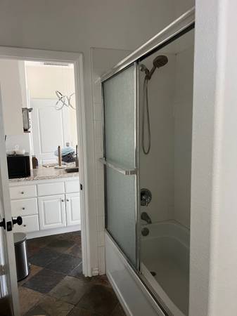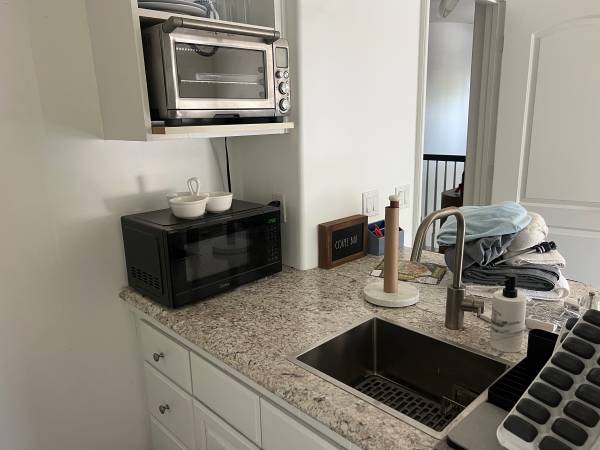 bedroom, bath with spacious living room, upstairs unit inside the house, secure private door. Features a kitchenette, midsize fridge, microwave, mini oven for light cooking, and a queensize bed in the bedroom. Private bathroom with shower and tons of free street parking. Washer and Dryer in the house, all amenities part of rent.