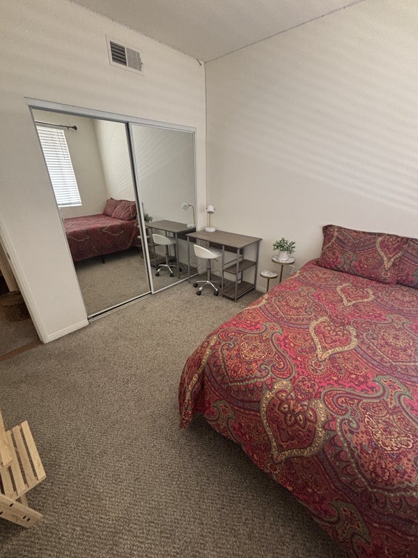 Room Details Private bedroom Private bathroom Large mirrored closet Furnished or Unfurnished bedroom Shared kitchen - fully loaded Washer and dryer in unit Air conditioning Plenty of parking in the complex Elan Pacifico Complex- well maintained with gated entry Full access to pool area and gym No pets allowed