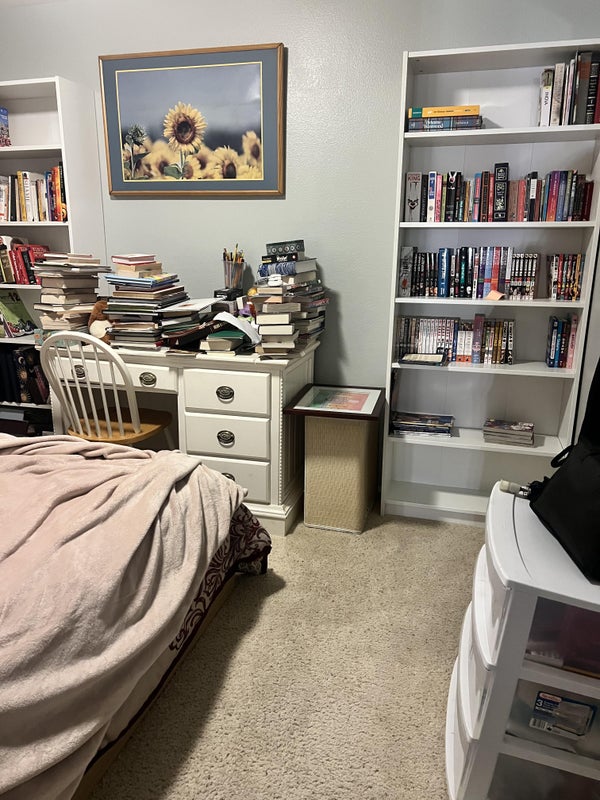We will clear an entire bookcase, but one bookcase will still have books on it. Also, will clear the desk of all the books on it currently.