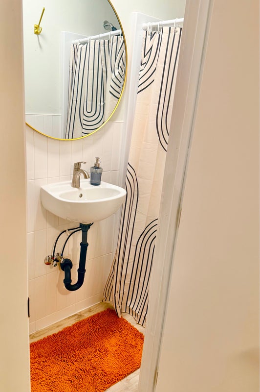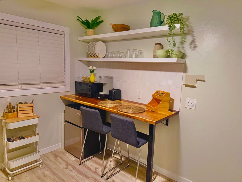 Large private and newly upgraded guest room that is studio size. Private entrance, own bathroom, property parking and private deck. This also comes with a kitchenette. This guest room comes fully furnished with light kitchen essentials and a smart tv that is mounted. Utilities & internet all included.