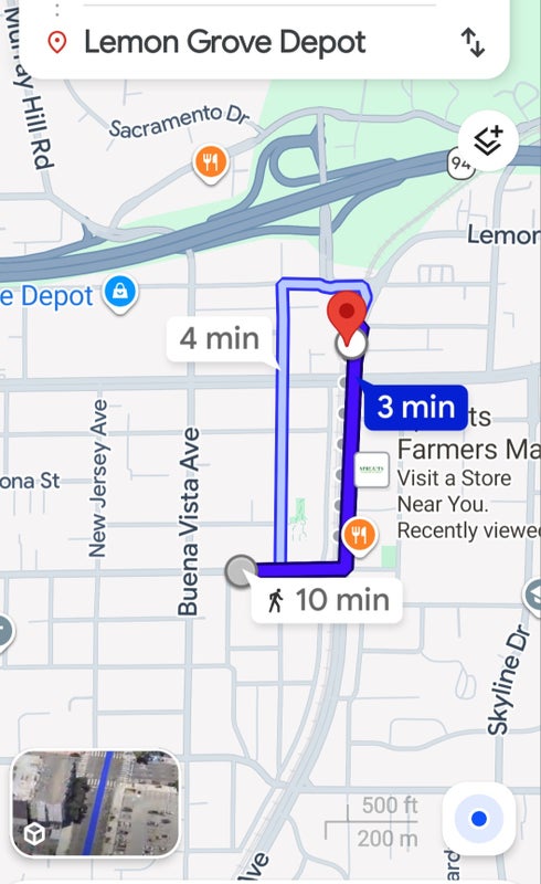 10 minutes walking from front door to bus & trolley station at Lemon Grove Depot, verified via mapquest.