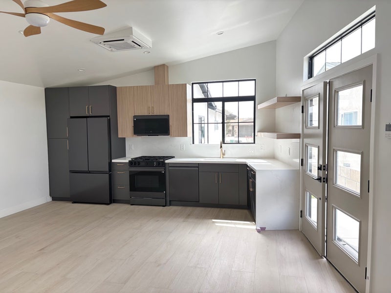 This recently completed modern style build is 1 bedroom, 1 bathroom, unfurnished with its own private entrance. It has a living room and full kitchen with all brand new appliances, including full sized fridge, gas stove, dishwasher, and its own wash and dryer in unit, plus AC. The unit is currently available and open for immediate move in.
