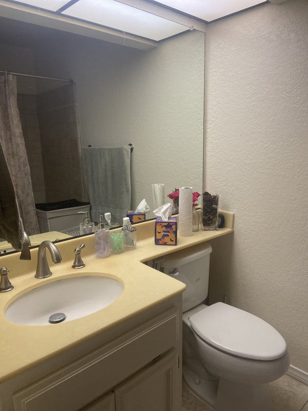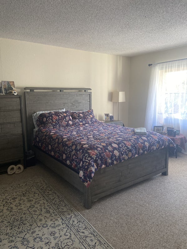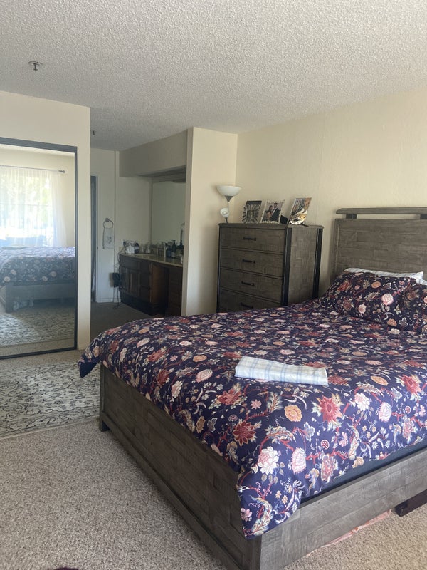 One large bedroom with dressing area and bathroom and two big closet. Resort apartment has two pools and two spa, tennis court and inside court.. laundry is in community. Parking space is in garage or outside with guests passing.