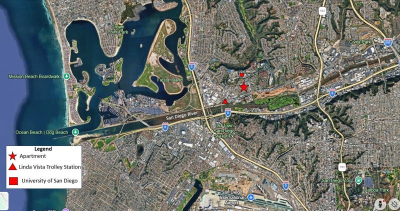 The apartment is centrally located with great access to the 5 & 8 Highways so getting to Downtown or the airport is easy. Additionally it is: - Located two blocks from the University of San Diego Campus - Less than a mile from Tecolote Canyon - Trolley Access – 15 min walk to Morena/Linda Vista Trolley Station - 10 min bike away from the San Diego River