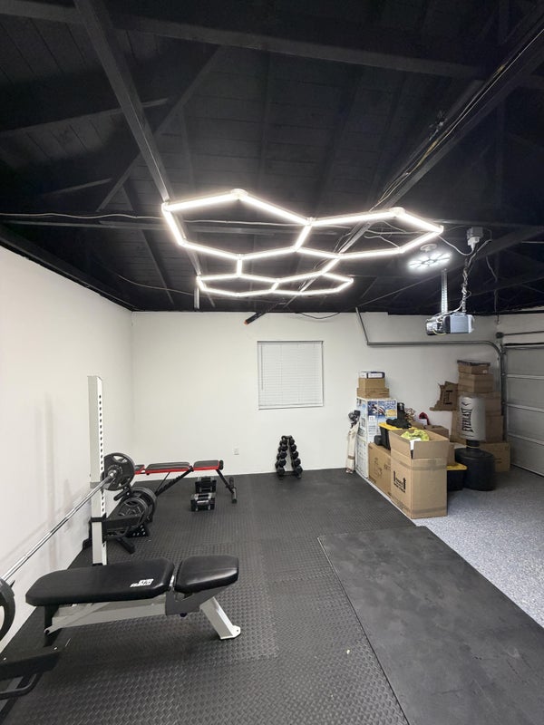 • Dedicated home gym in the garage: power rack, bench, dumbbells, heavy bag, and protective floor mats perfect for staying fit at home.