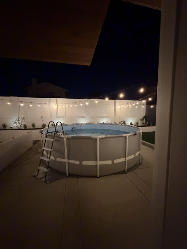 • Amazing backyard oasis: Large concrete patio with string lights, fire pit for relaxing evenings, above ground pool, outdoor movie screen + projector for movie nights, game days, or chilling under the stars. Artificial turf, privacy walls, and plants give it a resort feel.