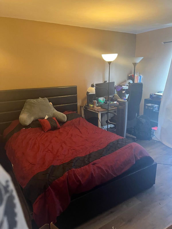Estimated square feet: 1100 Master bedroom: 15 x 14 (also has balcony) (currently available room) - $1350, can be shared by a couple Bedroom 2: 13 x 10 (has own exit door) - vacant; listed for $1100. Bedroom 3: 12 x 10 - vacant; listed for $1050. Bedroom 4: 10 x 10 - Currently occupied by early 30s male working professional.