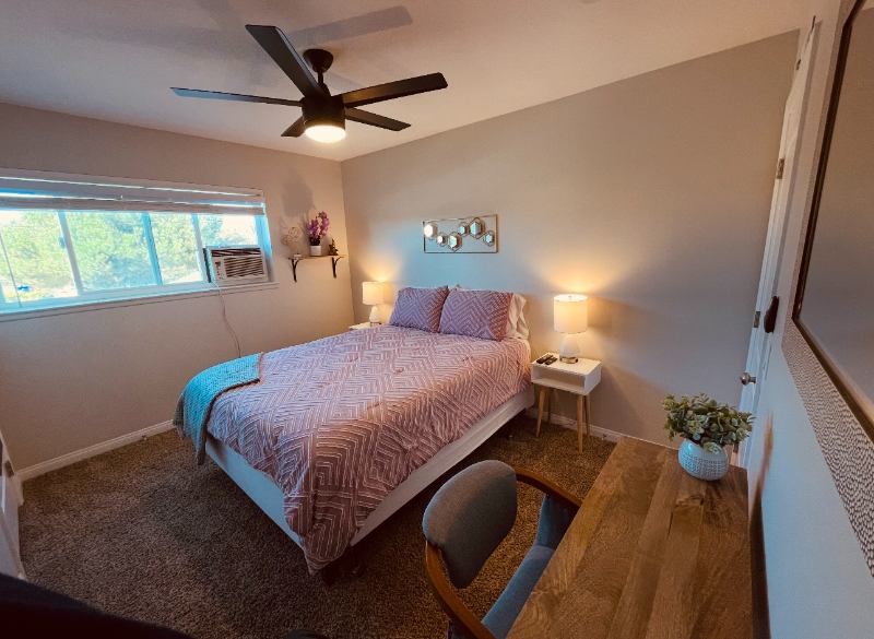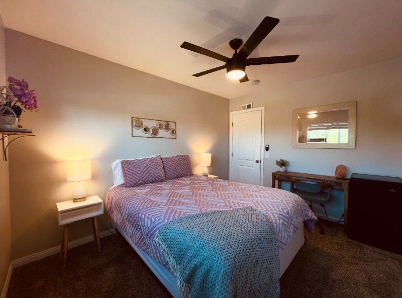 The room includes a mini fridge, a working desk, smart TV, AC unit, blackout curtains and ceiling fan for ultimate privacy and relaxation. You'll also have access to: