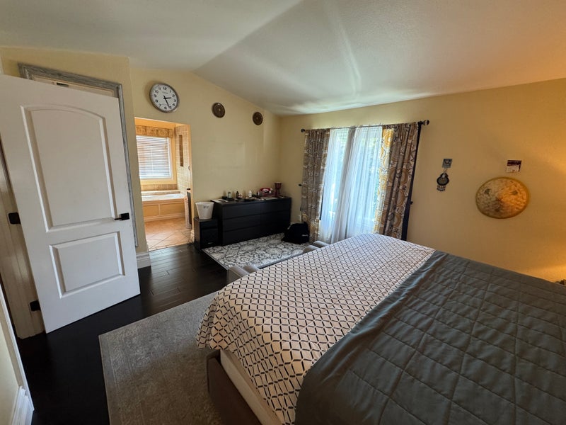 -Huge master bedroom, furnished with king size bed, two nightstands, ottoman, six-drawer dresser, and huge mirror