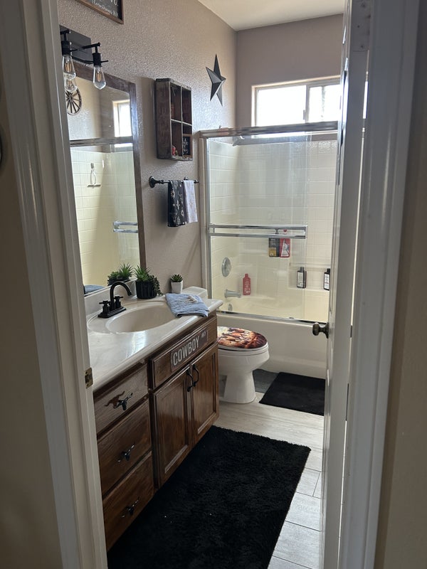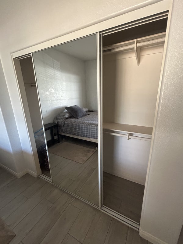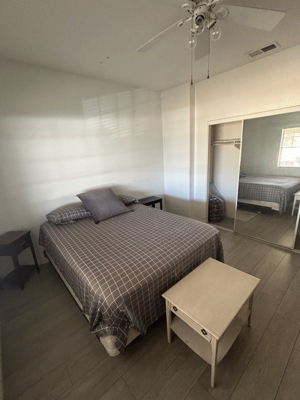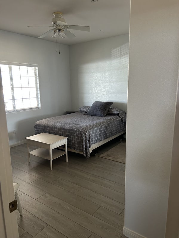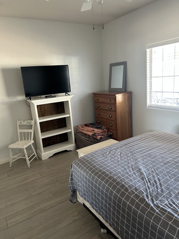 Roughly 15 x 13 room not including closet size, high ceilings, ceiling fans, furnished includes TV. Mirrored closet doors, brand, new paint, and blinds. View of property and front patio, no pets, 420 friendly but smoking outside. Must be neat and respectful. Not a late night residence with no drinking and partying. Current roommates are very chill. Easy to get along with. Male preferred, prefer someone who works full-time and not home all the time.