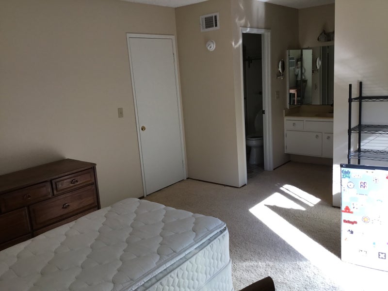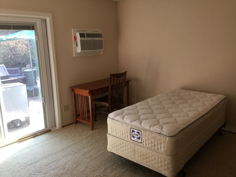Master bedroom with bathroom (shower, no tub), walk-in closet, in-wall air conditioner, private entrance at back of house. Single occupant only. About 240 sq. ft. Furnished. I do not have cable TV or an antenna, just internet. I have a mini refrigerator that you can use and you are welcome to supply your own microwave, electric kettle or coffee maker. Quiet, safe neighborhood. Parking on driveway or street. Looking for someone who will be VERY quiet after 5pm, will do their evening socializing away from the house, and won't have many visitors (daytime only). Must not be allergic to dogs, bees, or wasps. One mile to the bus stop (#115). Walking distance to Mission Trails Regional Park. About 4 miles to Grossmont College and SDSU. Near the intersection of Mission Gorge Rd. & Jackson Dr., SD. Background and criminal checks required.