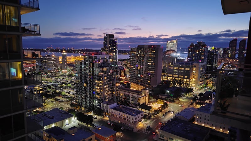 The room is recently furnished with a queen size bed, large flat screen, nightstand, velvet chest, blackout curtains, mirrored closets, is carpeted and very plush and comfortable. The room looks out over the downtown skyline, the San Diego Bay, and Coronado.