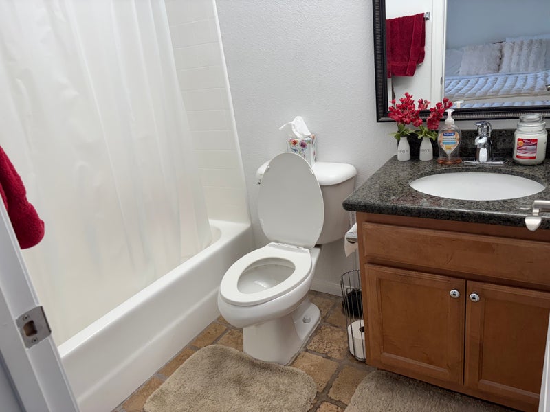 Bright, airy, quiet furnished room with attached bath in a 2B2BA condo that I rent in a quiet and safe complex in Carmel Valley. It is close to shops and restaurants. 1/2 mile from Piazza Carmel, 1 mile from Del Mar Plaza and a few miles from the beaches. In unit Washer/Dryer and free off street parking. I am an older woman and would prefer the same. Best fit is someone who wants a low key, no drama and respectful environment and works outside the home.