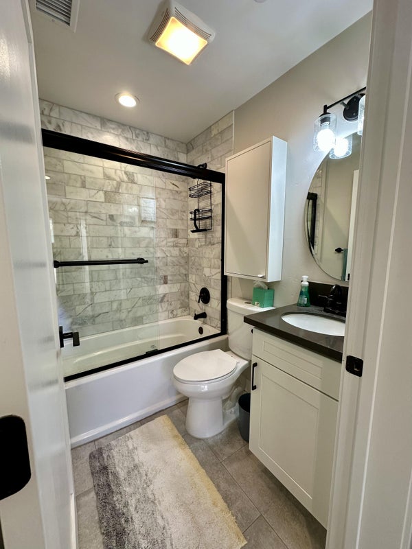 Home is a newly furnished 4-level townhouse with 3 bedrooms (one is my office), 2.5 baths, and a private rooftop terrace that includes seating, fire pit, and a gas grill. The bedrooms are on the 2nd level. 3rd level is the kitchen, dining, and living rooms with two large balconies. First-floor garage and entryway. One covered parking space is available. Small amount of storage space in garage if needed.
