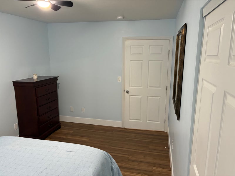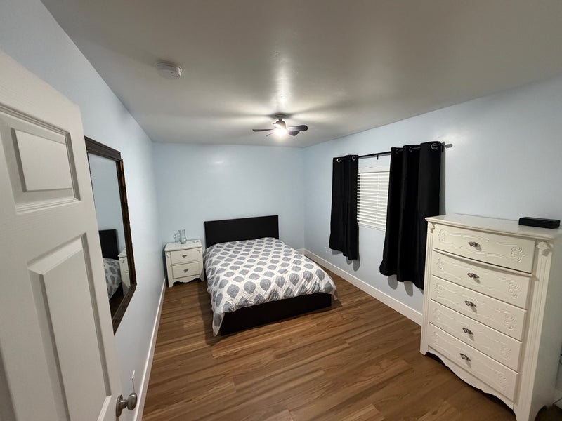 Room is approx. 150 sqft., has a full-sized bed, with a ceiling fan and natural light and window coverings.