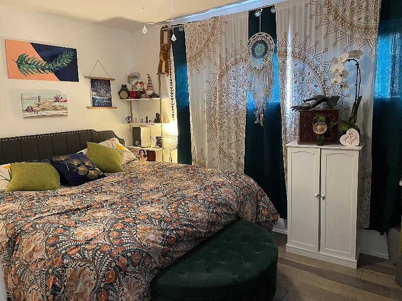 The property is furnished with a king size bed, a dresser, and a desk or vanity. The rest of the house is available to use as well.