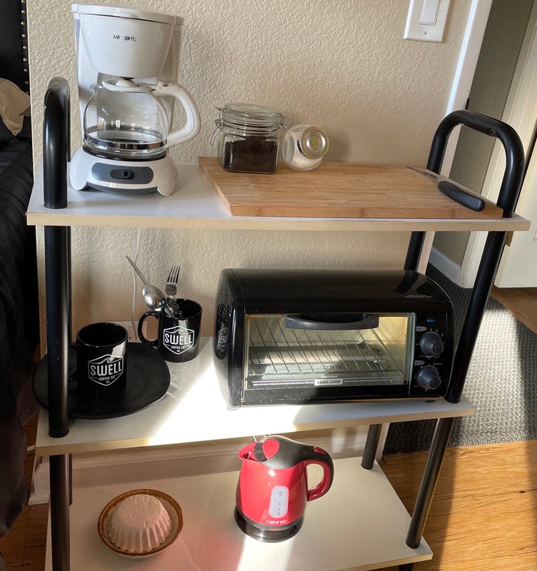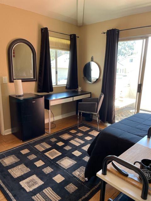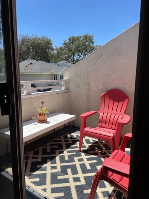 Your room is on the 2nd floor and feels like a small apartment because of the private balcony and mini kitchen in the room. It has a soaring vaulted ceiling, a spacious walk-in closet, a private balcony with a rug, coffee table and seating for two that feels like an additional sunny room. The bath is shared with one person (currently a VA nurse), and with an expectation of a high level of cleanliness.