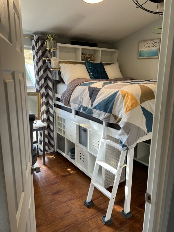 The available room is compact but thoughtfully arranged with a raised loft bed, storage underneath, and a small desk area by the window overlooking the garden.