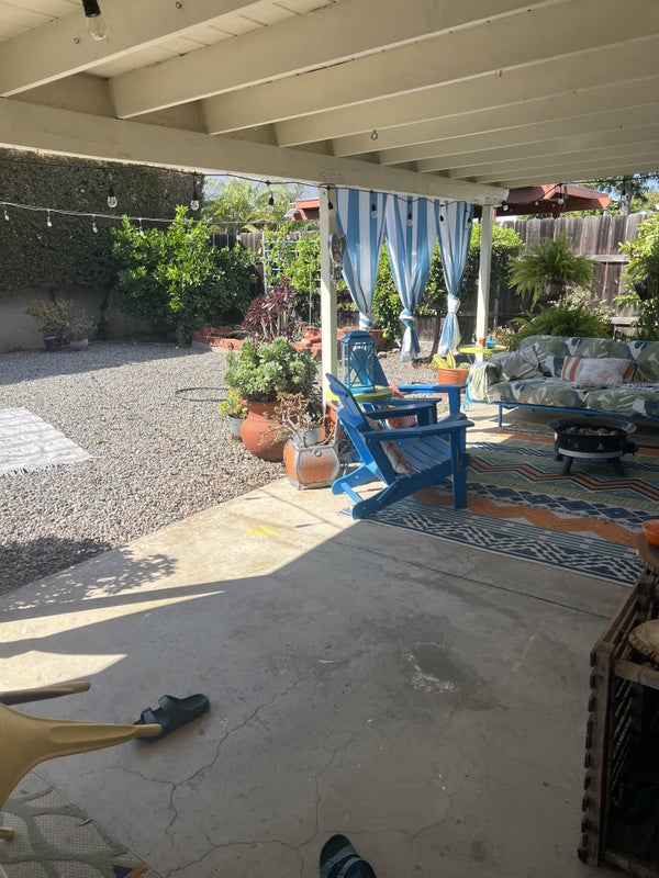 The house is bright and welcoming with an open layout and lots of natural light. The living room opens to a comfortable backyard patio, and the kitchen and dining area are spacious and functional. The backyard has a covered patio with seating and a fire pit, making it a great space to relax in the evenings.