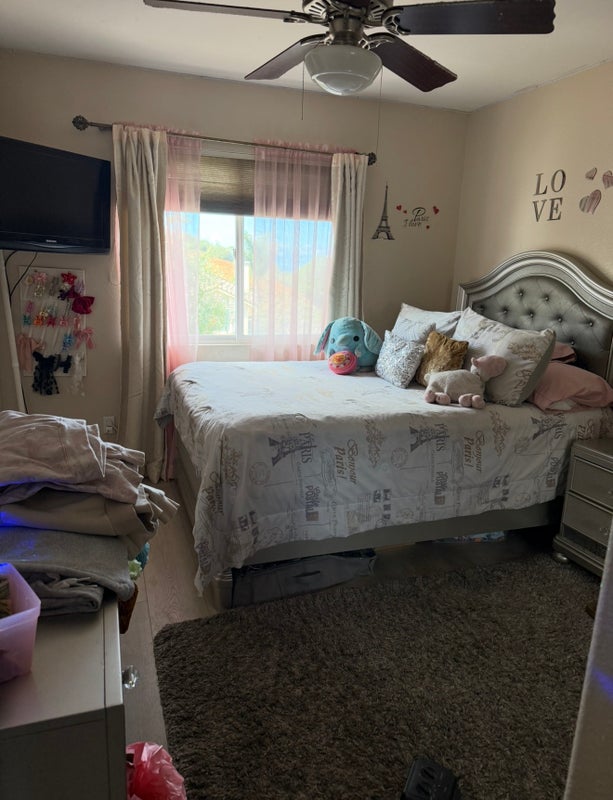 2 adults living in a 5 bedroom house. Renting 2 bedrooms with its own vanity, sharing bathroom. Master bedroom with its own bathroom $1,850.00 p/month. Use of kitchen and kitchen utensils, use of one refrigerator for the tenants. Cleaning lady every 2 weeks. street parking available. Nice and quiet gated community.