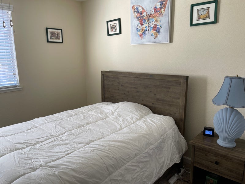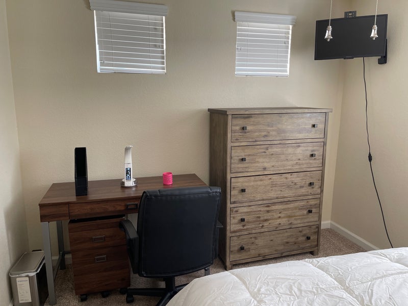Furnished with desk and TV Private bath Washer/dryer Filtered water and air through out house 10 minutes to freeway and grocery stores Backyard 10 fruit trees Alarm and cameras inside and outside house Park in front garage Need tenant rental insurance Background check