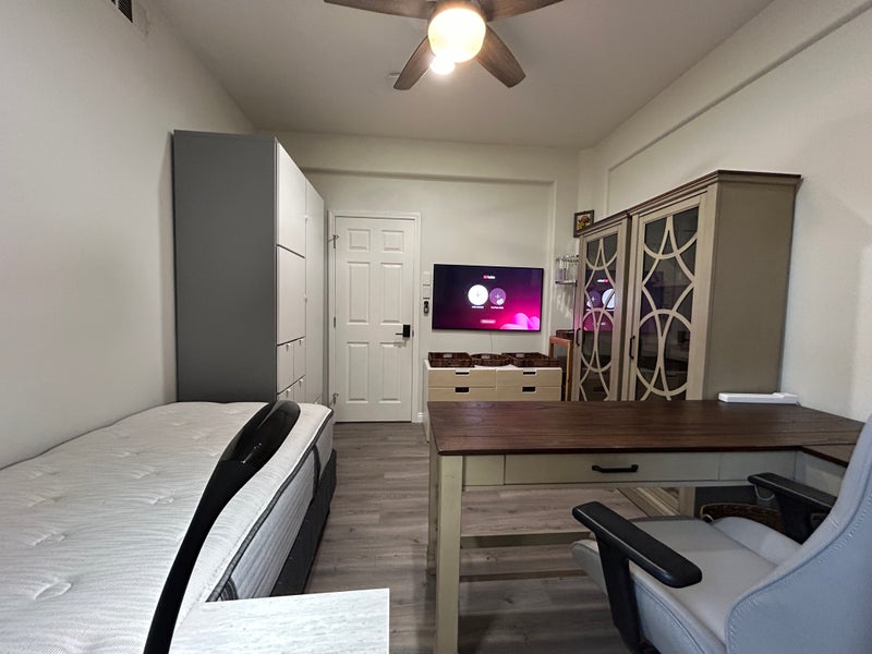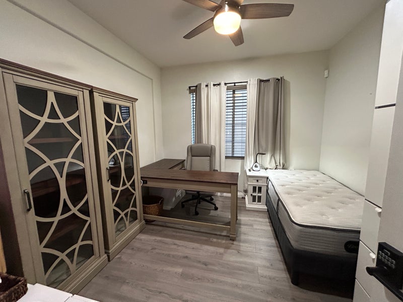 A nice and unique furnished room in a great location. The room is located on the first floor on the side of the house and was originally designed as a private office. It comes with high-quality, almost new furniture and offers a comfortable and quiet living space. Excellent access to major shopping and services. Located one block from St. John’s Hospital, and very close to Walmart Supercenter, Vons, Sam’s Club, and Best Buy. Optional dedicated parking available for a compact car. Available March 15, 2026 Included • All utilities included (with reasonable usage) • Fully equipped kitchen • High-speed Wi-Fi (Frontier Fiber) Room Details Approx. 125 sq ft, including a detached closet. Originally designed as an office (see floor plan). Furniture and features include: • 50" Samsung QLED Frame TV with flush wall mount • Bed options: o Twin bed with sit/stand desk and two drawer units (current setup) o Optional full-size bed with sit/stand desk and one drawer unit • Executive chair • Two large bookcases with doors • Large IKEA wardrobe • Access to additional storage space • Optional 7.5 cu. ft. dedicated refrigerator Rent & Terms • Rent: $985/month • Deposit: $985 (flexible) • Shared bathroom with a very considerate gentleman who works as an ICU nurse Ideal Tenant Professionals who value a quiet, respectful living environment are highly preferred. • LinkedIn profile preferred (Facebook is also welcome) • Male preferred • No pets (sorry) • No drugs or smoking • No overnight guests without prior approval Please tell us about yourself before requesting a visit. Once you introduce yourself, we’ll be happy to answer any questions. Application Requirements • Most recent pay stubs required • Rental application required • If approved, lease agreement options: 3, 6, 12, or 24 months (Listed price based on a 6-month lease)